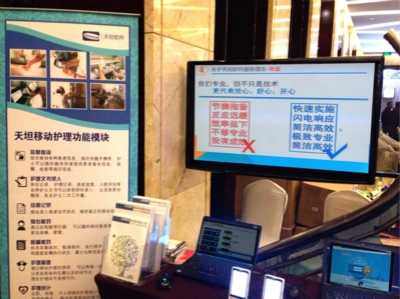 展會期間我公司接待了觀展及參展人員數(shù)百人,眾多人員關切詢問我公司產品,本次展會我公司展出了天坦移動護理系統(tǒng),天坦移動查房系統(tǒng),及醫(yī)療大數(shù)據(jù)分析平臺,通過現(xiàn)場演示受到了眾多專業(yè)人士和媒體的高度關注,尤其是天坦移動護理系統(tǒng)吸引了眾多觀眾的眼球。