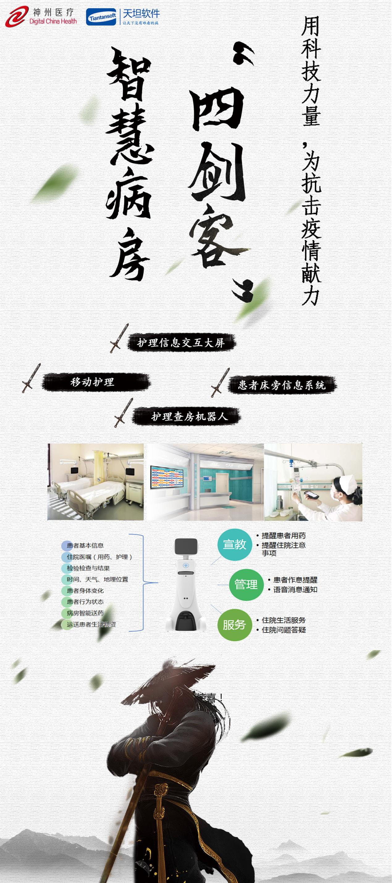 神州天坦智慧病房"四劍客",是神舟天坦憑借著十余年在醫(yī)療衛(wèi)生領域中豐富的行業(yè)經(jīng)驗積累,并針對此次新冠疫情防治的一線醫(yī)護人員日常工作需求,優(yōu)選出的可以快速搭建、臨床實用性高的智慧病房四大子系統(tǒng),具有很強的建設價值。以軟硬件、物聯(lián)網(wǎng)和人工智能技術(shù),構(gòu)筑起防治新型冠狀病毒的信息化關(guān)口,為醫(yī)護人員診療工作、患者住院服務進行保駕護航。以科技的力量為抗擊疫情獻力,我們一起攜手同行、共克時艱。贏得這場沒有硝煙的戰(zhàn)“疫”,中國加油!戰(zhàn)“疫”必勝!
